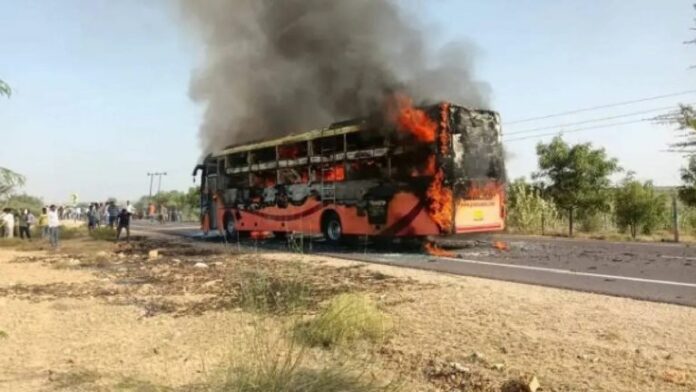 According to initial reports, the incident occurred around 3 PM on the Jaisalmer–Jodhpur Highway. Eyewitnesses said thick plumes of smoke began rising from the air-conditioned bus, prompting the driver to stop immediately. However, the flames spread within seconds, trapping several passengers inside before they could escape.