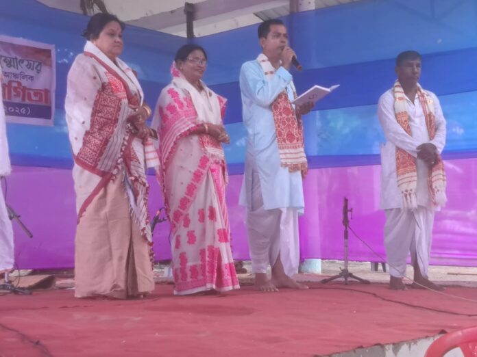 It was followed by a dihanaam competition which was inaugurated by Pradip Saikia. Earlier to the dihannam competition child artistes Pranalika Saikia, Italy Kalita performed Borgeet while Jyotismita Saikia performed Jhumura. Karabi Saikia and Smritjyoti Hazarika graced the competition as judges. The second-day programme began with hoisting of the religious flag by Deben Saikia, president of Nagsankar regional committee of Srimanta Sankardev Samaj today followed by a Bhagawat procession inaugurated by Basav Bhuyan, headmaster of Jamuguri Academy.