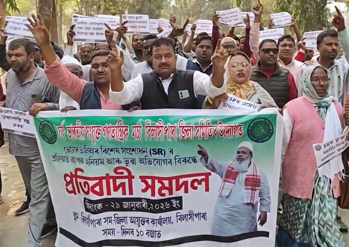 Bilasipara: The All India United Democratic Front (AIUDF) staged a massive protest in Bilasipara on Thursday, raising strong objections to alleged irregularities in the Special Revision (SR) process. Party leaders, workers, and supporters gathered outside the Co-district Commissioner’s office, chanting slogans against Chief Minister Dr. Himanta Biswa Sarma.
