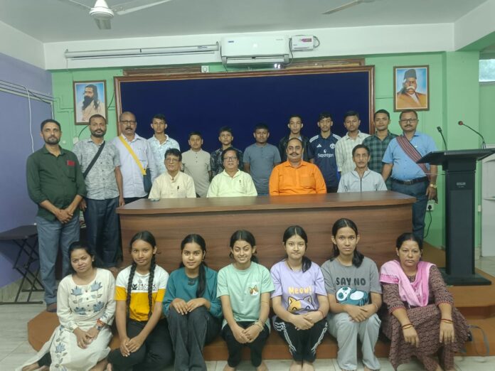 The team was given a warm send-off at the Assam Prakashan Bharati auditorium, where dignitaries extended their best wishes for a successful performance. Present at the farewell were Dr. Pawan Tiwari, Organization Minister of Vidya Bharati Northeast; Dr. Jagdeindra Raychoudhury, Regional Secretary; Jagannath Rajvanshi, General Secretary of Shishu Shiksha Samiti Assam; Ratul Deka, Provincial Head of the Sanskriti Bodh Project; and Mahananda Das, Regional Head of Vedic Mathematics.
