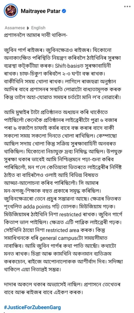 Guwahati: Assamese vocalist Maitrayee Patar has issued a public appeal to authorities, calling for improved management and security at Zubeen Kshetra, the memorial dedicated to the iconic singer Zubeen Garg. In a recent Facebook post, Patar stressed that both the singer and the site belong to the public, and she urged the administration to establish a “robust and disciplined security system” to proactively prevent any unfortunate incidents.