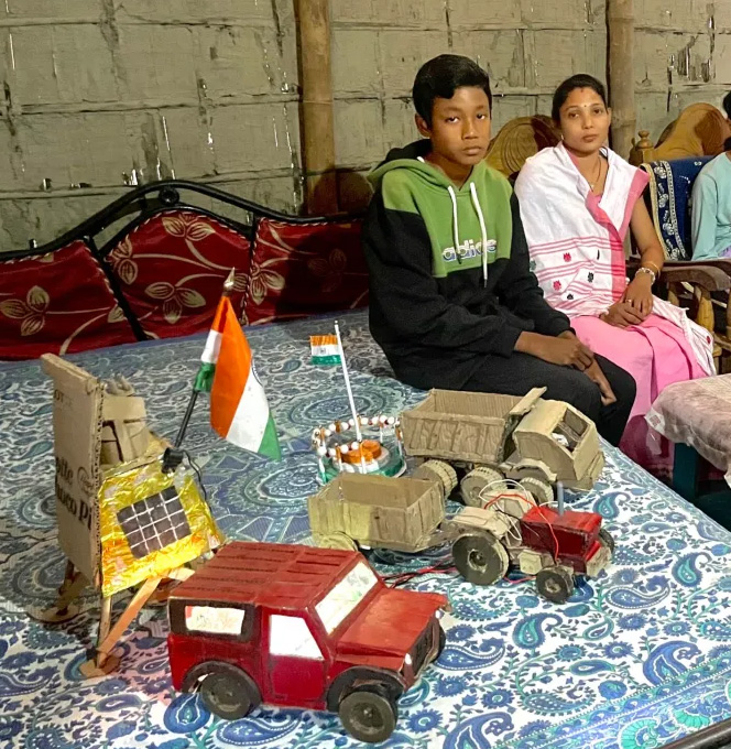 Hailing from Doloi Gaon–Halgiri Ghat village, Rahul comes from a financially modest family. His father, Dipak Talukdar, is an e-rickshaw driver, while his mother, Kanaklata Talukdar, manages the household. Despite limited resources, Rahul has shown a keen interest in science, mechanics and innovation from an early age, teaching himself basic engineering and electrical principles through observation and experimentation. Inspired by India’s Chandrayaan-3 mission and the agricultural and construction machinery commonly seen in rural life, Rahul has transformed everyday materials into impressive working models through curiosity and dedication. Alongside his interest in innovation, he also plays the traditional Nagara drum at various programmes, earning a small income to support himself.