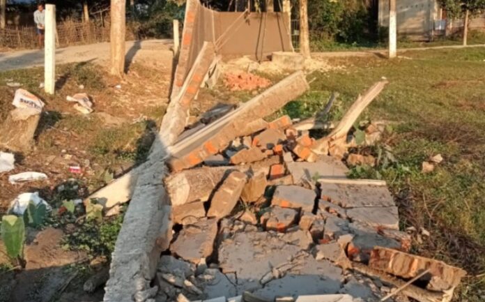 Nazira: A portion of the boundary wall under construction at Bihubar High School in Nazira collapsed on Tuesday night, triggering strong reactions from residents and raising serious concerns about the quality of the work.
