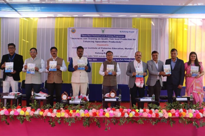 Inaugurating the program, Dr N P Sahu, Director, ICAR-CIFE, Mumbai, said that CIFE will support Kalong-Kapili to move forward. He stated that quality fish seeds are scarce across the country. Species such as rohu, catla, and mrigal can attain up to 5 kg within one year by adopting various scientific techniques, including the development and use of improved varieties like Jayanti Rohu and Maha Magur. He highlighted that Andhra Pradesh has the highest fish production in India, while Assam ranks fourth. He stressed the need to focus on per capita fish consumption while simultaneously strengthening national fish production. He also emphasized the need for a long-term vision to strengthen fish production for the next 50 years. To increase farmers’ income, scientific fish farming practices must be adopted, including the use of quality fish seeds and intensive systems such as Biofloc and RAS. He further highlighted the importance of feed production and maintaining fish health. Dr Sahu also said that farmers who receive training at Kalong-Kapili will also receive financial support from the Bank of India.