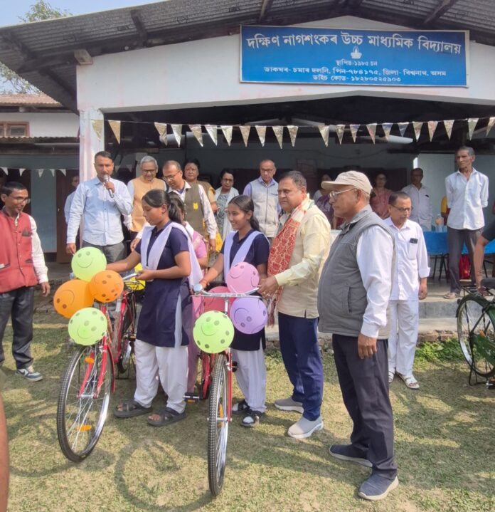 Biswanath Chariali: Biswanath MLA Pramod Borthakur today attended the free bicycle distribution ceremony held at Dakhin Nagsankar High School, Samar Dalani. Inaugurating the free bicycle distribution ceremony, MLA Borthakur lauded the state government for adopting and enforcing a series of student centric welfare schemes. Notably, free bicycles have been distributed among the class IX students of government and provincialised schools under the chief minister’s special scheme for the last many years.