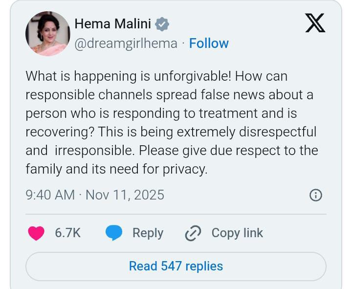 “What is happening is unforgivable! How can responsible channels spread false news about a person who is responding to treatment and is recovering? This is being extremely disrespectful and irresponsible. Please give due respect to the family and its need for privacy,” Hema Malini wrote.
