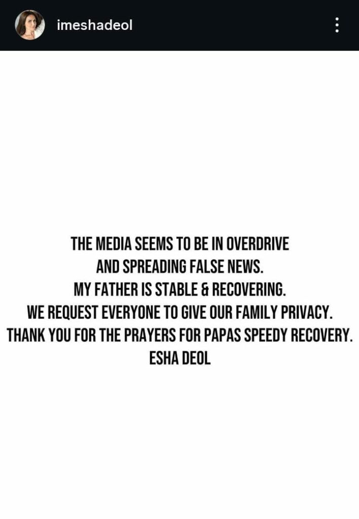Esha Deol, the couple’s daughter, also took to Instagram to denounce the false news, writing, “THE MEDIA SEEMS TO BE IN OVERDRIVE AND SPREADING FALSE NEWS. MY FATHER IS STABLE & RECOVERING. WE REQUEST EVERYONE TO GIVE OUR FAMILY PRIVACY. THANK YOU FOR THE PRAYERS FOR PAPAS SPEEDY RECOVERY.”