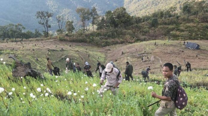 Imphal, Jan 16: Security forces, in coordination with the Forest Department and supported by the district administration, dismantled and destroyed nearly 10 acres of illegal poppy plantations in the Suangkong hill range of Manipur’s Churachandpur district on January 16, officials said. The action was taken as part of an intensified campaign against narcotics cultivation in vulnerable hill and forest areas.