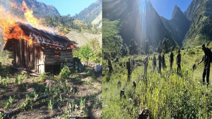 The largest operation took place in Ukhrul district, where security forces, in coordination with several government agencies, conducted sustained drives from November 11 to 15. In the hill ranges of Somdal, Lamlai Chingfei village and Litan, teams razed 436 acres of poppy cultivation and burnt down 51 huts used by cultivators.
