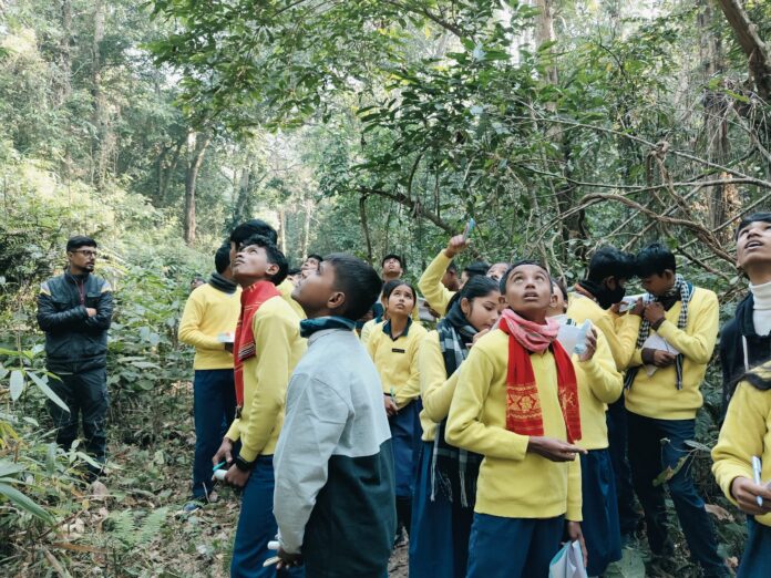 Guwahati: Students from Rongdoi High School, Jorhat, took part in an immersive nature trail at the Hollongapar Gibbon Sanctuary in Jorhat district, gaining first-hand exposure to Assam’s rich forest biodiversity and the threatened hoolock gibbon, India’s only ape species. The participants were thrilled to spot a family of five hoolock gibbons along with capped langurs, a Malayan giant squirrel, and a colourful variety of butterflies and spiders flourishing in the forest ecosystem. The trail was organised on January 16 as part of “Nature’s Wonderland – A Journey of Curiosity”, a flagship environmental education initiative of biodiversity conservation organisation Aaranyak.