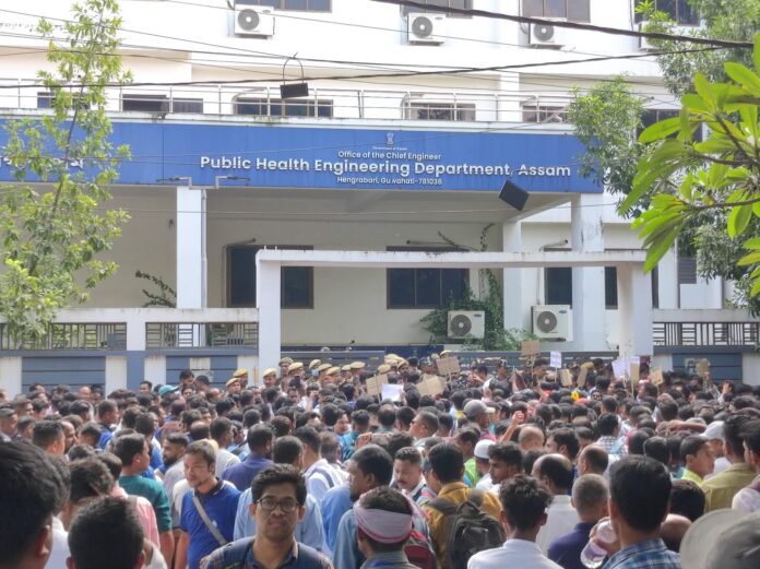 Guwahati: Tensions erupted outside the Public Health Engineering (PHE) Department office in Hengrabari on Monday as members of the All Assam PHE Temporary Workers’ Union (Jalmitra) staged a protest demanding job regularisation, fair wages, and social security.