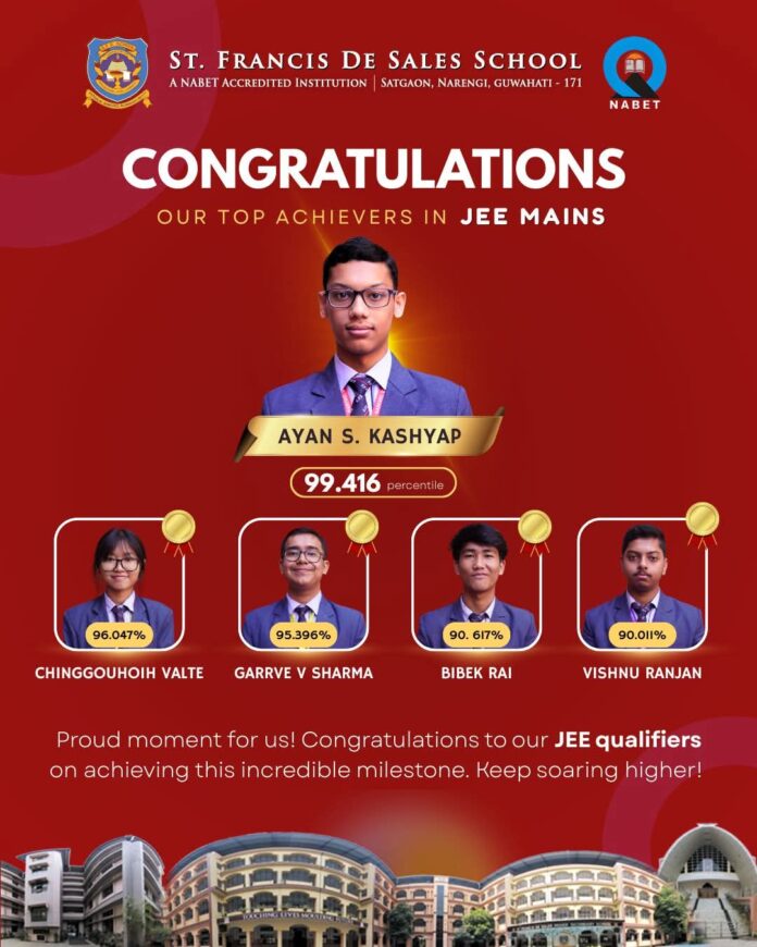 Guwahati, Feb 20: St. Francis De Sales School, Satgaon, Narengi, Guwahati, proudly celebrates the exceptional performance of its students in JEE Mains 2026. The school has once again demonstrated its commitment to academic excellence with outstanding results that have brought immense pride to the institution and the entire Desalite family.