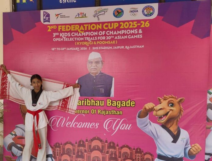 Biswanath Chariali: Tanishtha Bora, daughter of Biplab Bora and Rimjhim Bora, residents of Bahuwabari, Sootea has brought laurels to Sootea and to the state by winning a gold medal in the 2nd Federation Cup 2025-26, 3rd Kids Champion of Champions & Open selection Trials for Taekwondo for 20th Asian Games held at SMS stadium, Jaipur, Rajasthan from January 18 to 23. Tanishtha managed to win a gold medal defeating her opponent on Tuesday and qualifies for participation for the Asian Games.