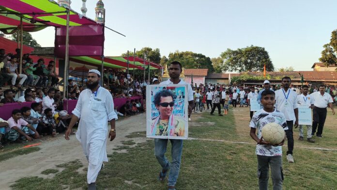 Tamarhat: At present, one sentiment echoes in the hearts of every admirer of Zubeen, justice for Zubeen. Various groups and organizations are raising their voices in different ways to demand justice for the beloved artist. Amidst this, a unique form of protest was observed in Kacharigaon, located near the Assam-Bengal border under Tamarhat police station in Dhubri district. A special eight-team “Zubeen Garg Memorial Football Tournament” was organized by the Kacharigaon Sports Club and the Kacharigaon Football Association.